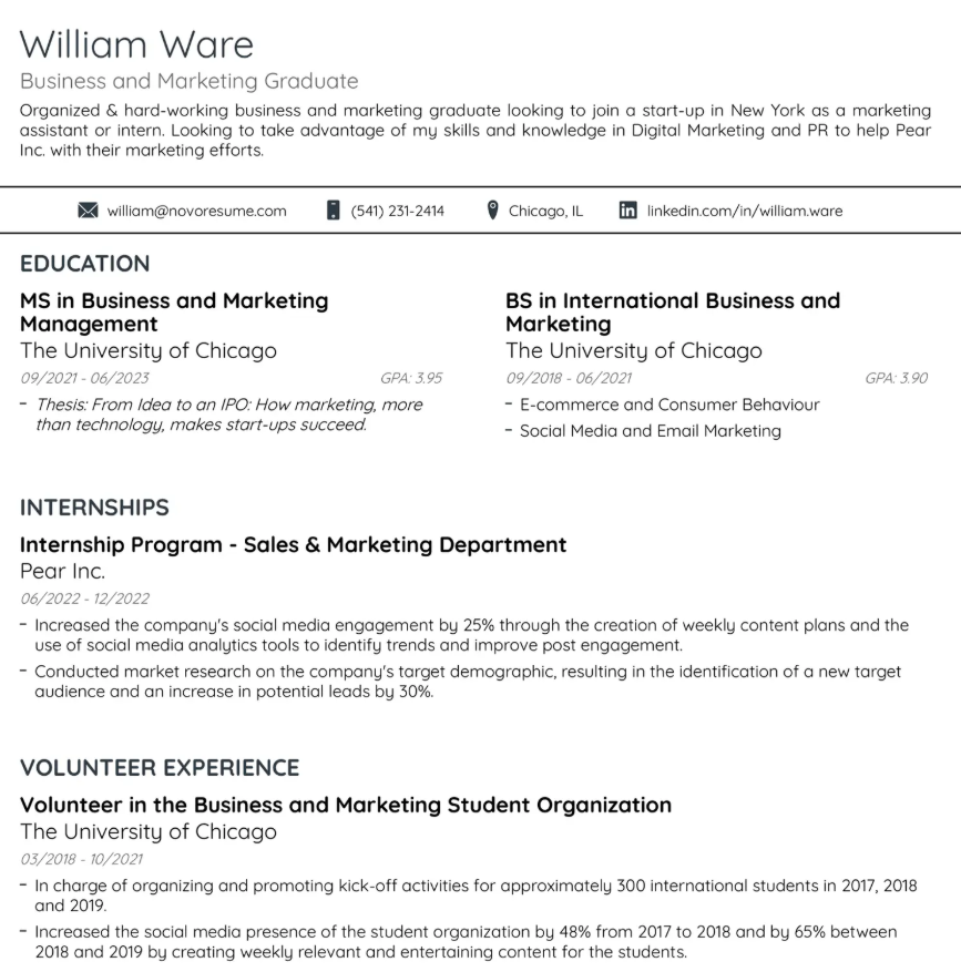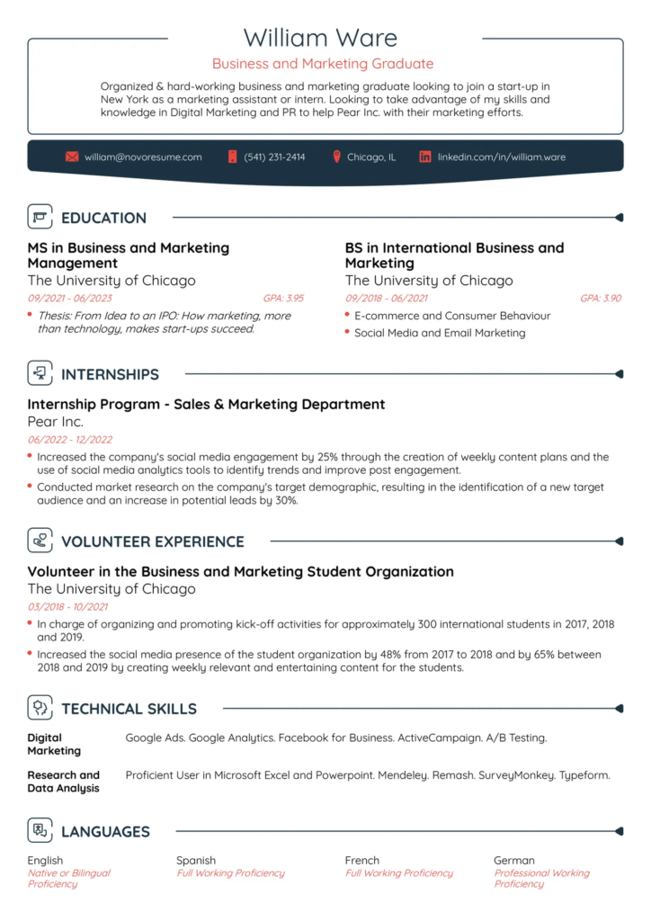 The Student Resume Template by Novorésumé is specifically built for students and freshers with little to no experience. It focuses on education, projects, internships, extracurriculars, and achievements.