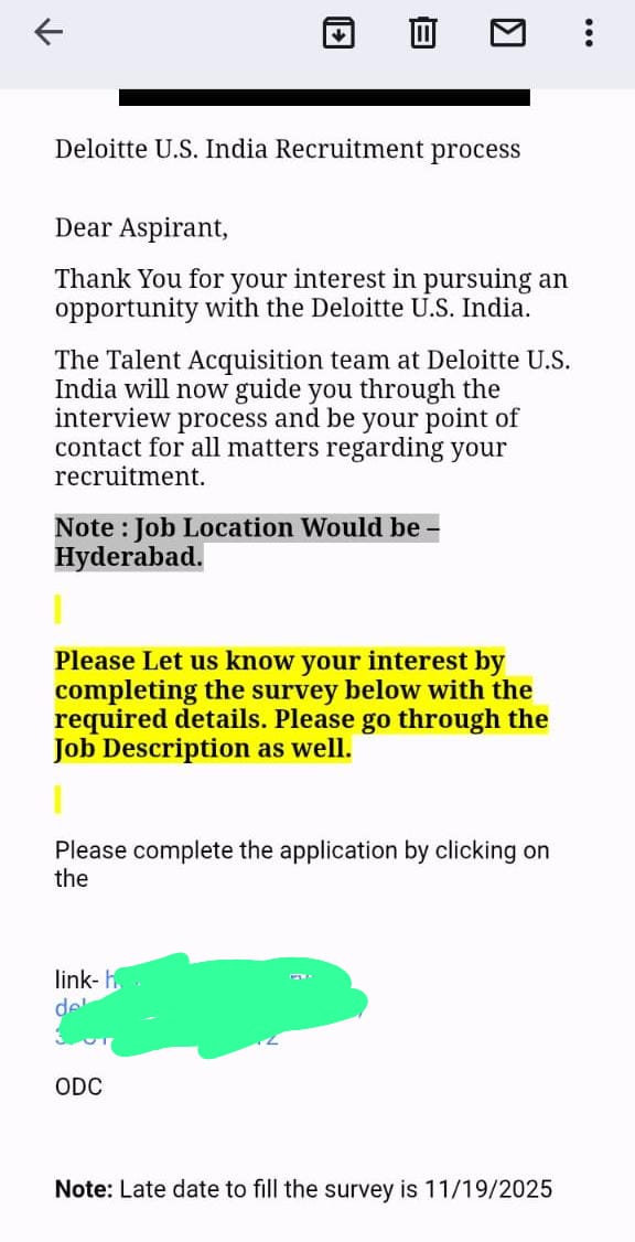 Deloitte sending test email for multiple roles 2022-2025 batch apply fast . This is a great opportunity for freshers and early-career professionals looking to kickstart their journey in a global IT services company. The position is based in Hyderabad, India and eligible candidates are encouraged to apply online at the earliest. The detailed eligibility criteria and application process are given below.